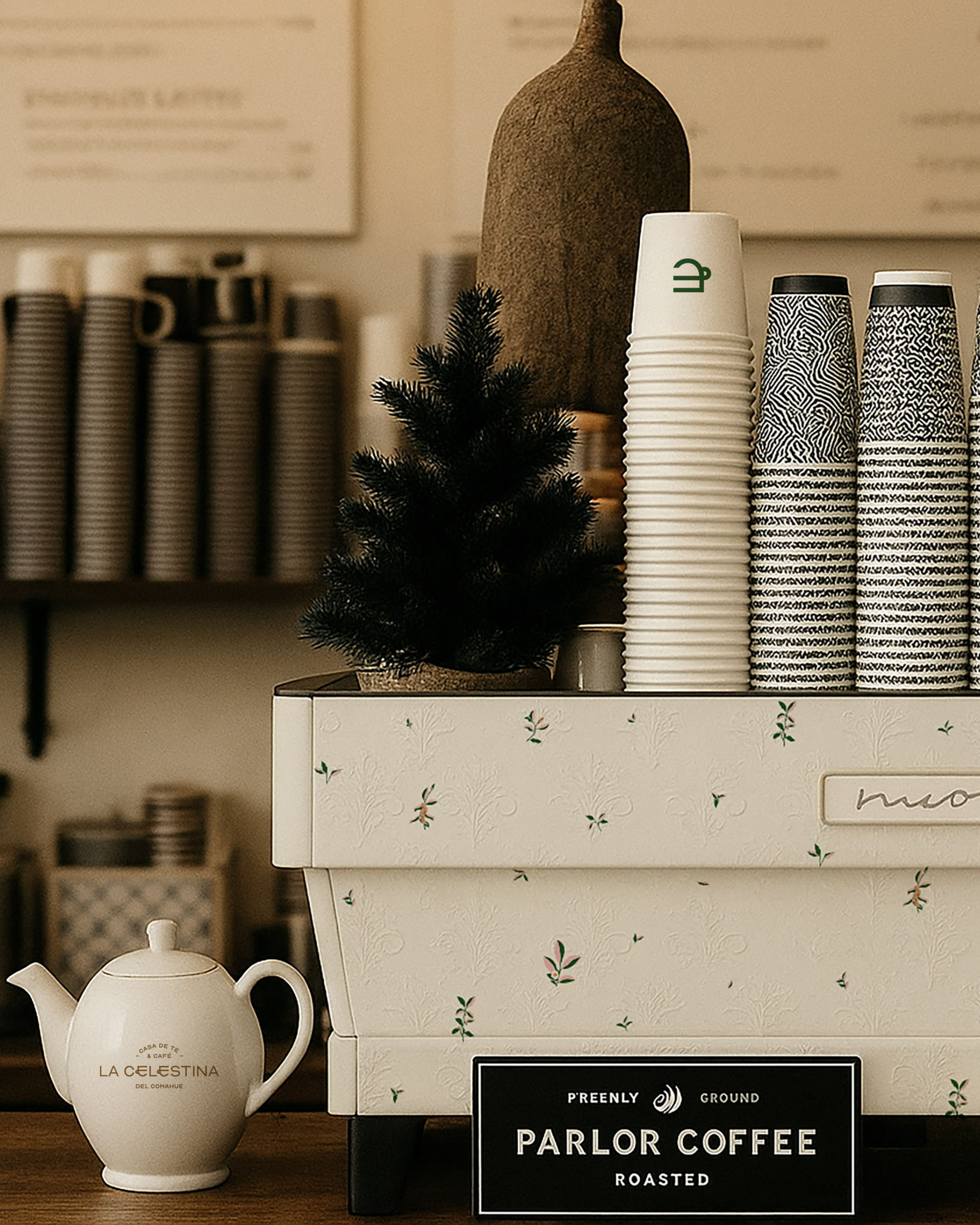 El proyecto incluyó menú, uniformes y elementos de packaging como cajas para tortas y galletitas, bolsas y vasos descartables. Cada pieza acompaña la identidad general, reforzando el carácter artesanal y acogedor del lugar.