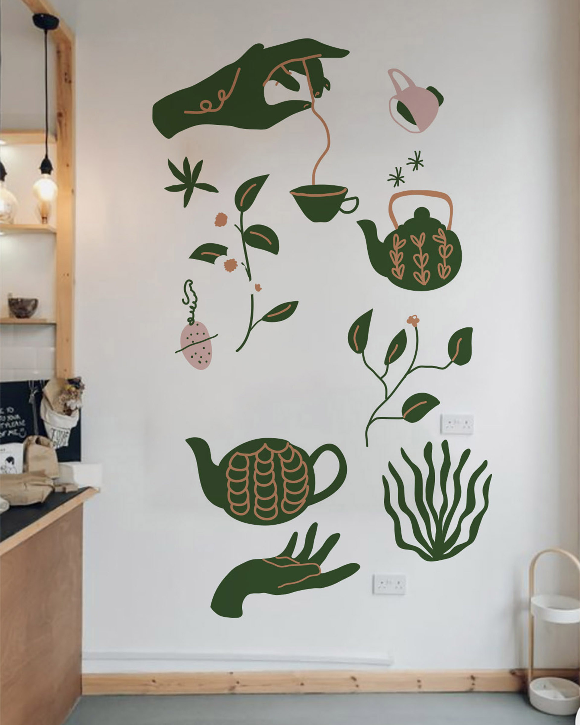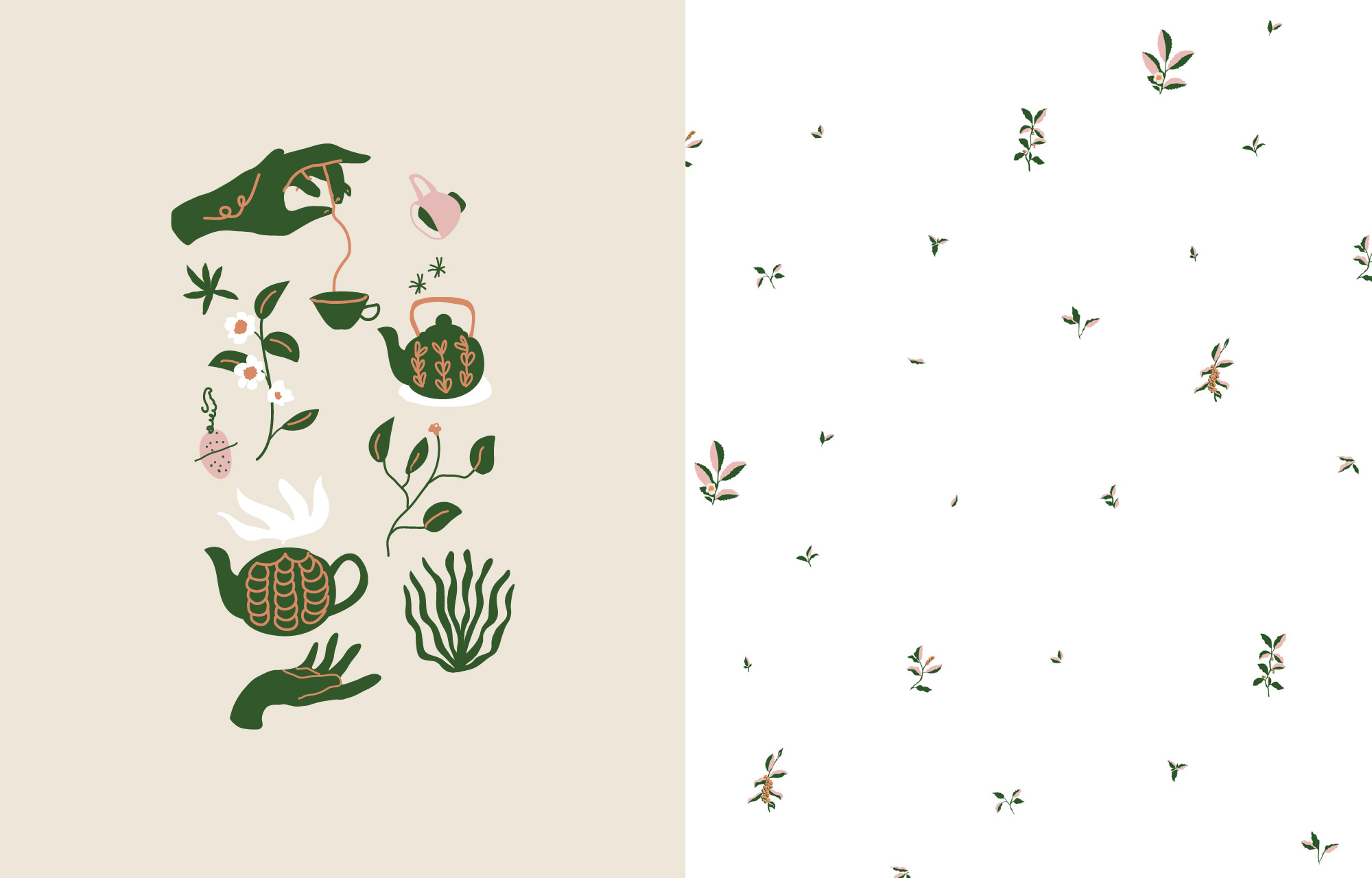 Se diseñaron ilustraciones que representan el universo del té: manos, tazas, ingredientes e infusiones. Además, una trama de hojas refuerza el vínculo con la naturaleza.