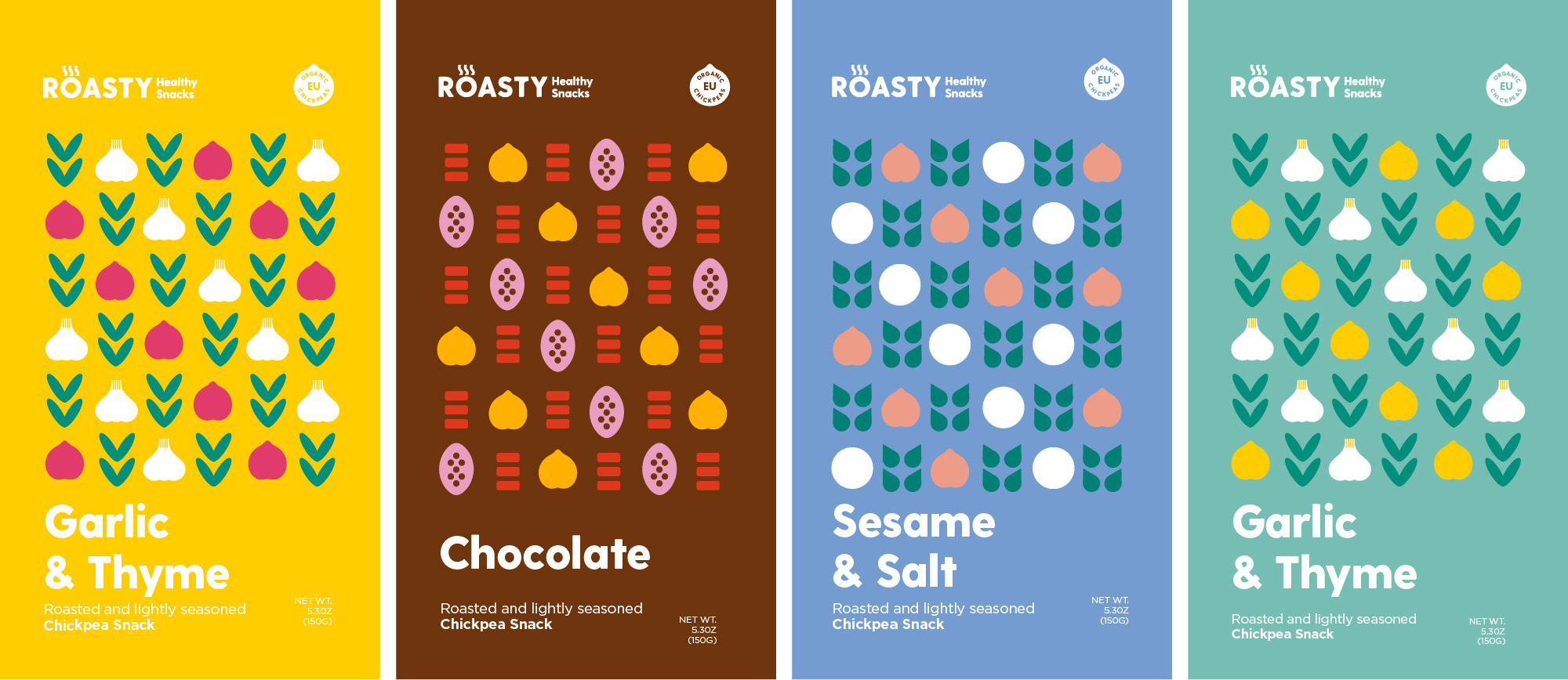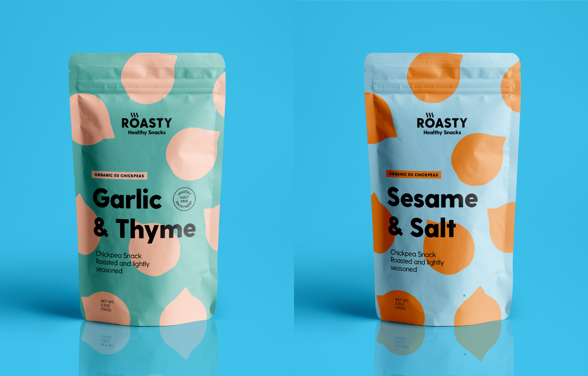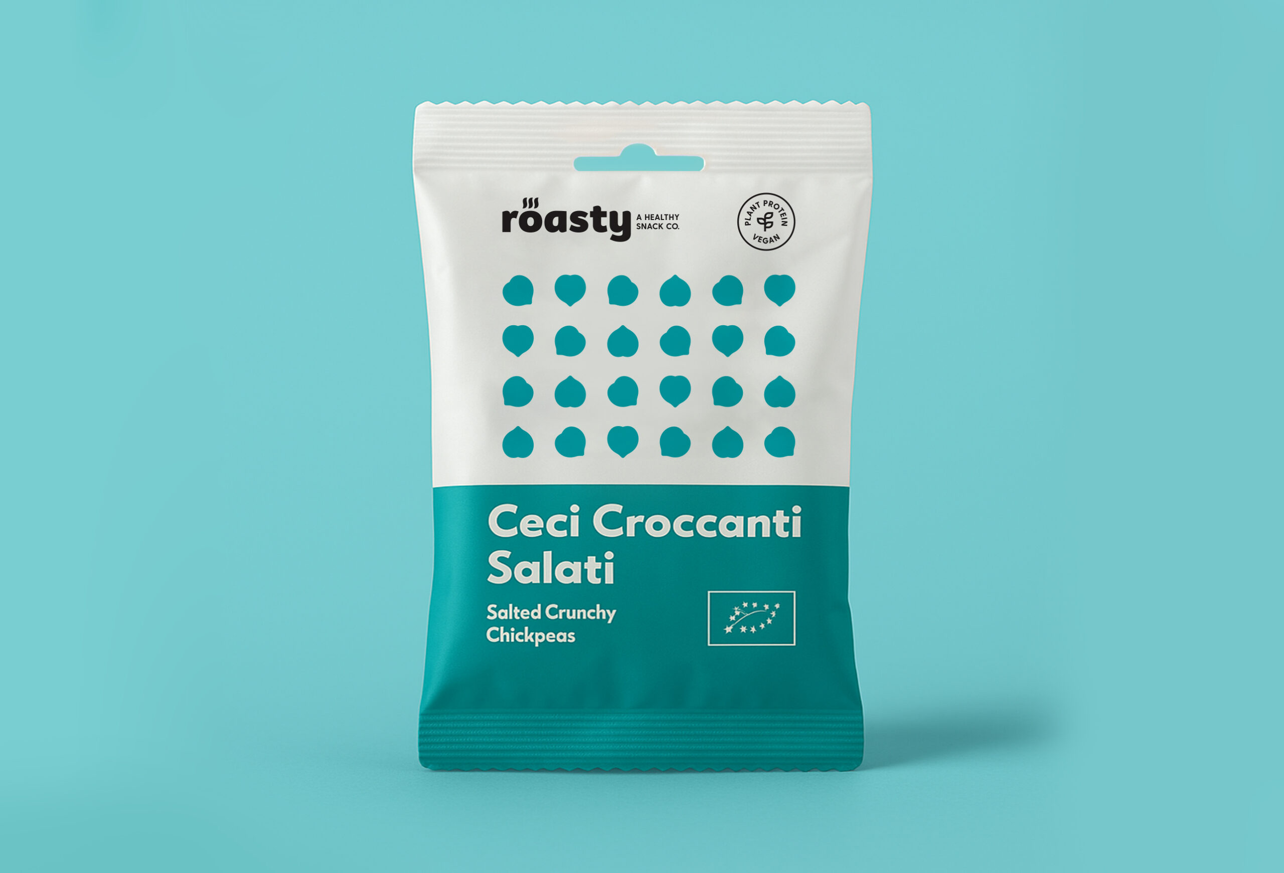Roasty is an Italian startup that was born in 2021 as a university project. It offers healthy and tasty roasted chickpea snacks. From the studio we developed its visual identity and packaging design, creating a modern, colorful brand with personality. The goal was to stand out in the competitive European market.