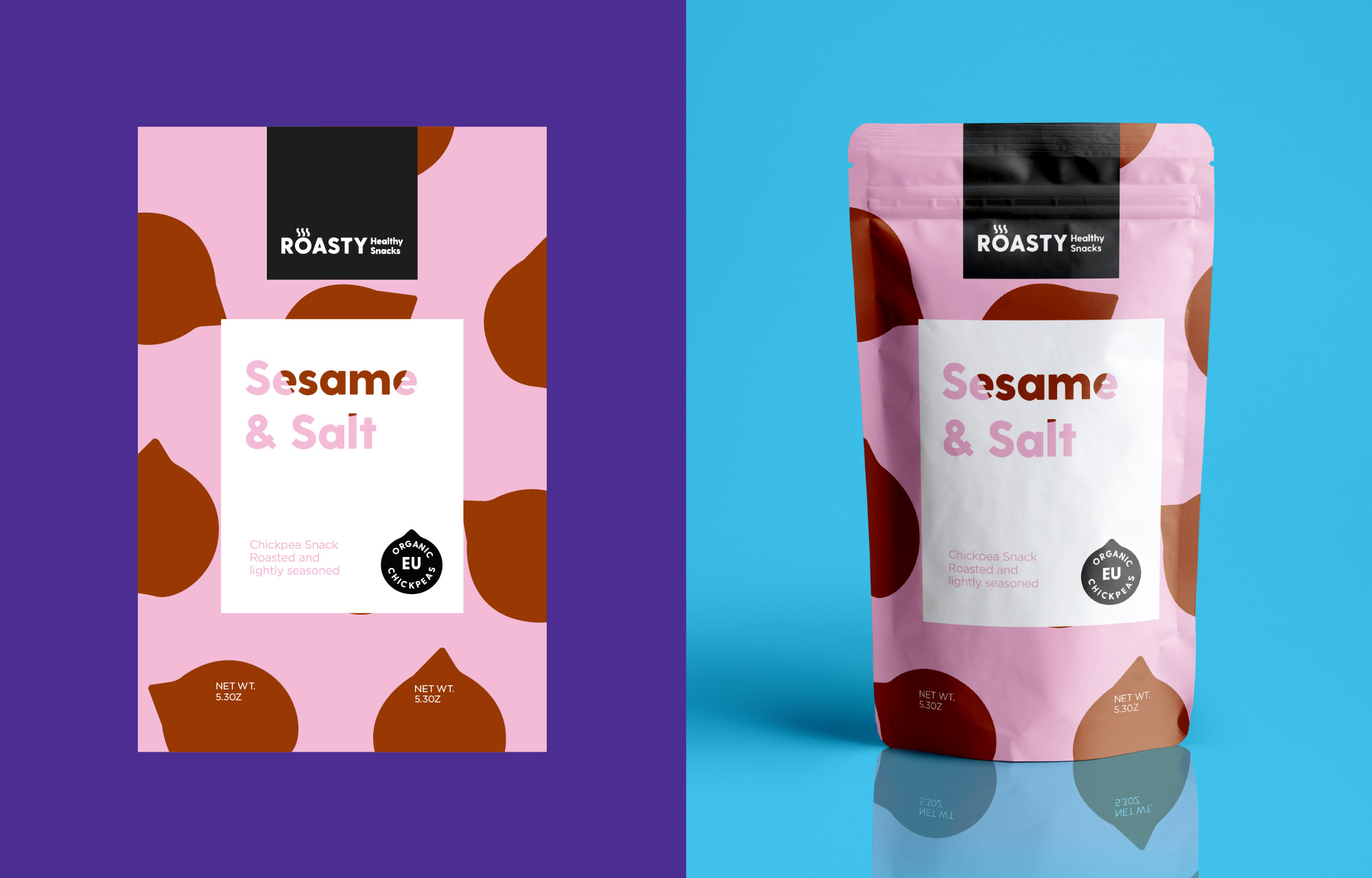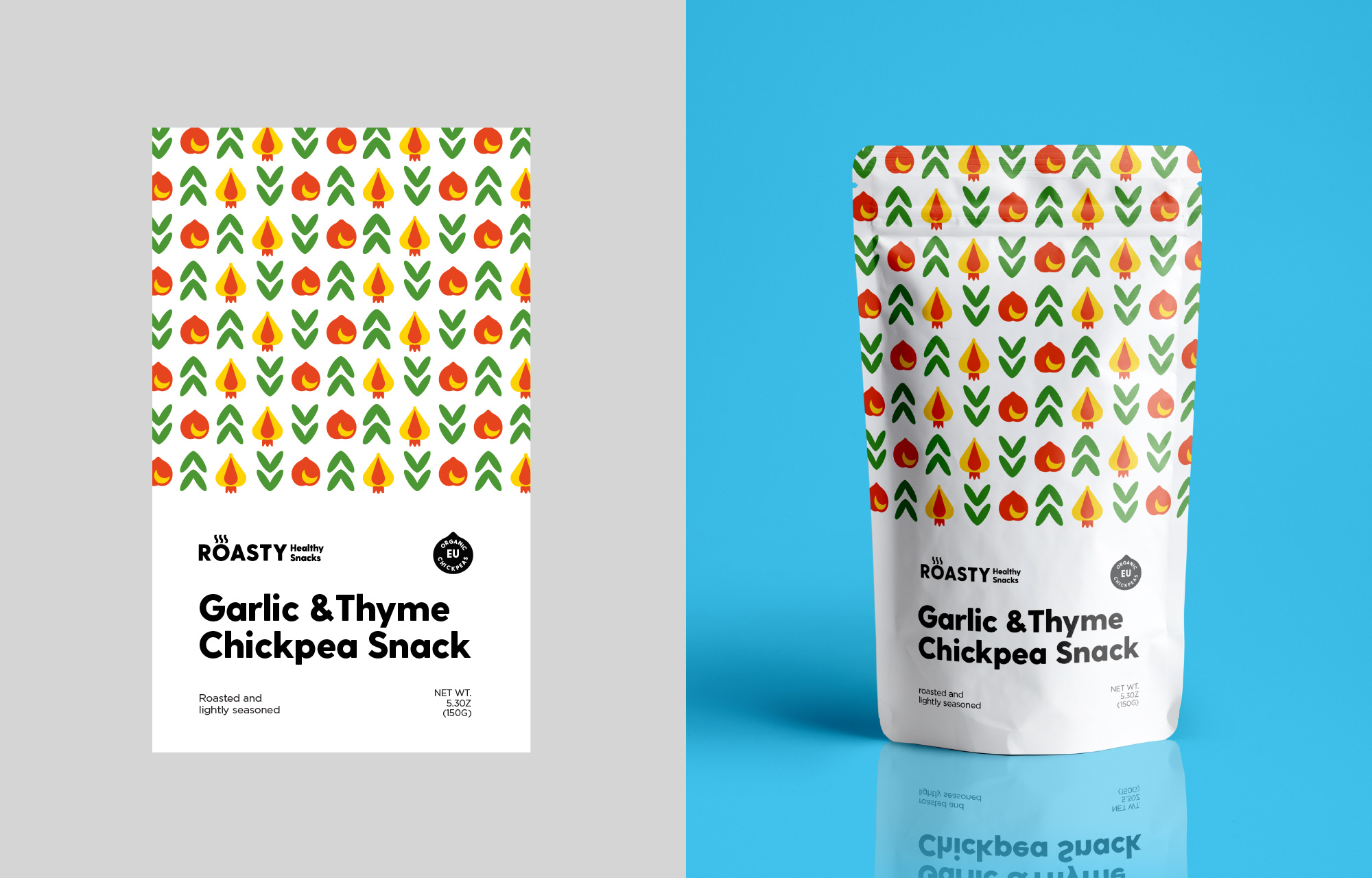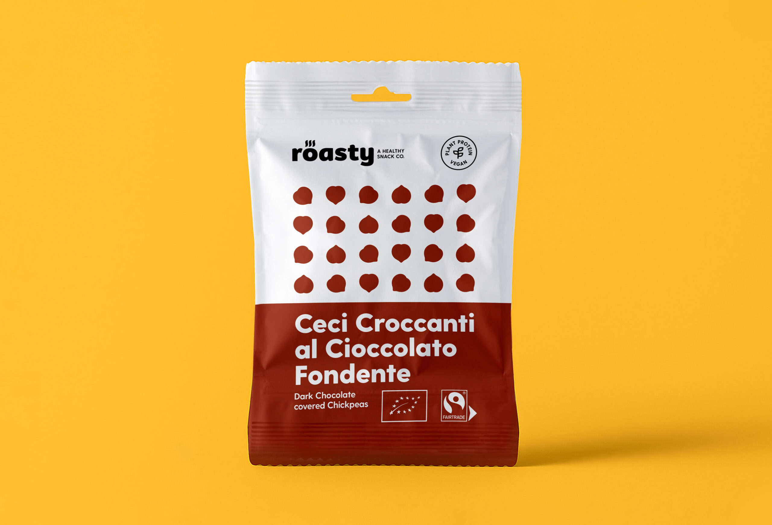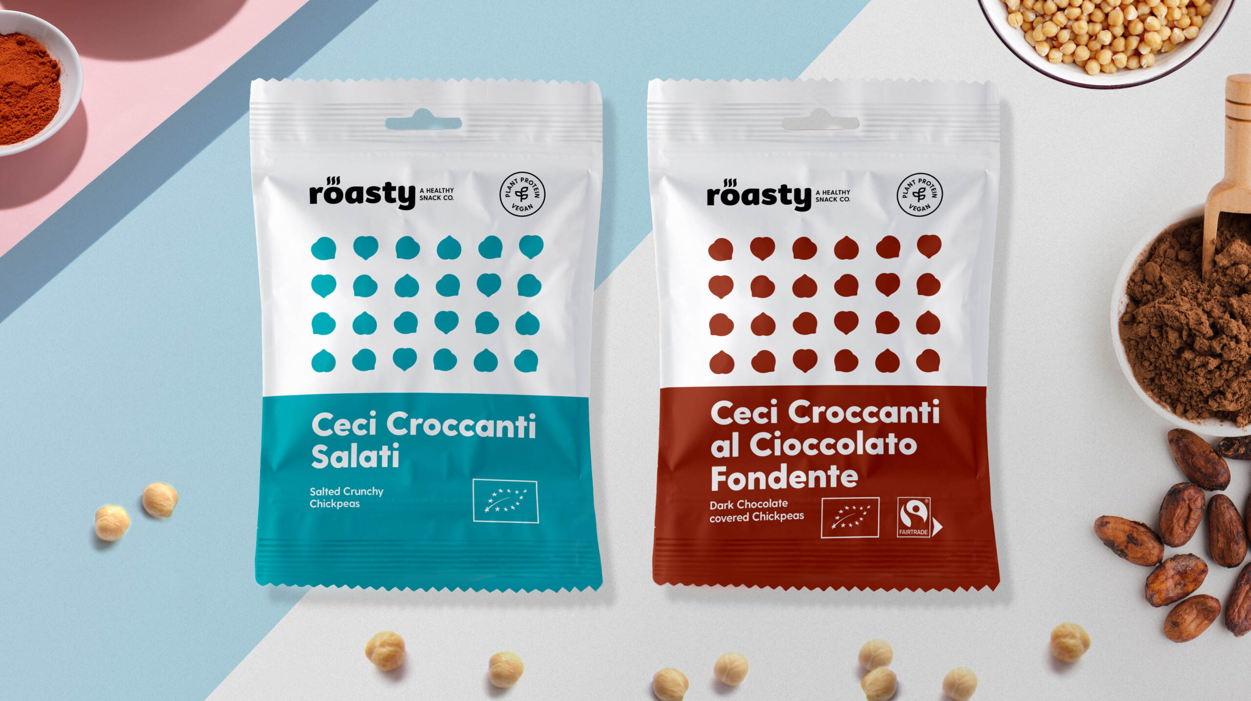 Roasty is an Italian startup that was born in 2021 as a university project. It offers healthy and tasty roasted chickpea snacks. From the studio we developed its visual identity and packaging design, creating a modern, colorful brand with personality. The goal was to stand out in the competitive European market.