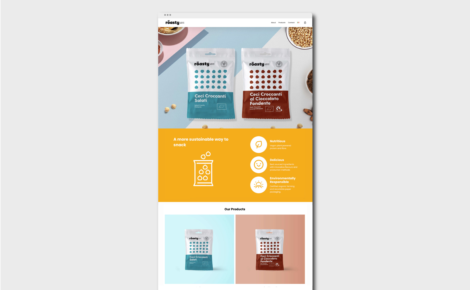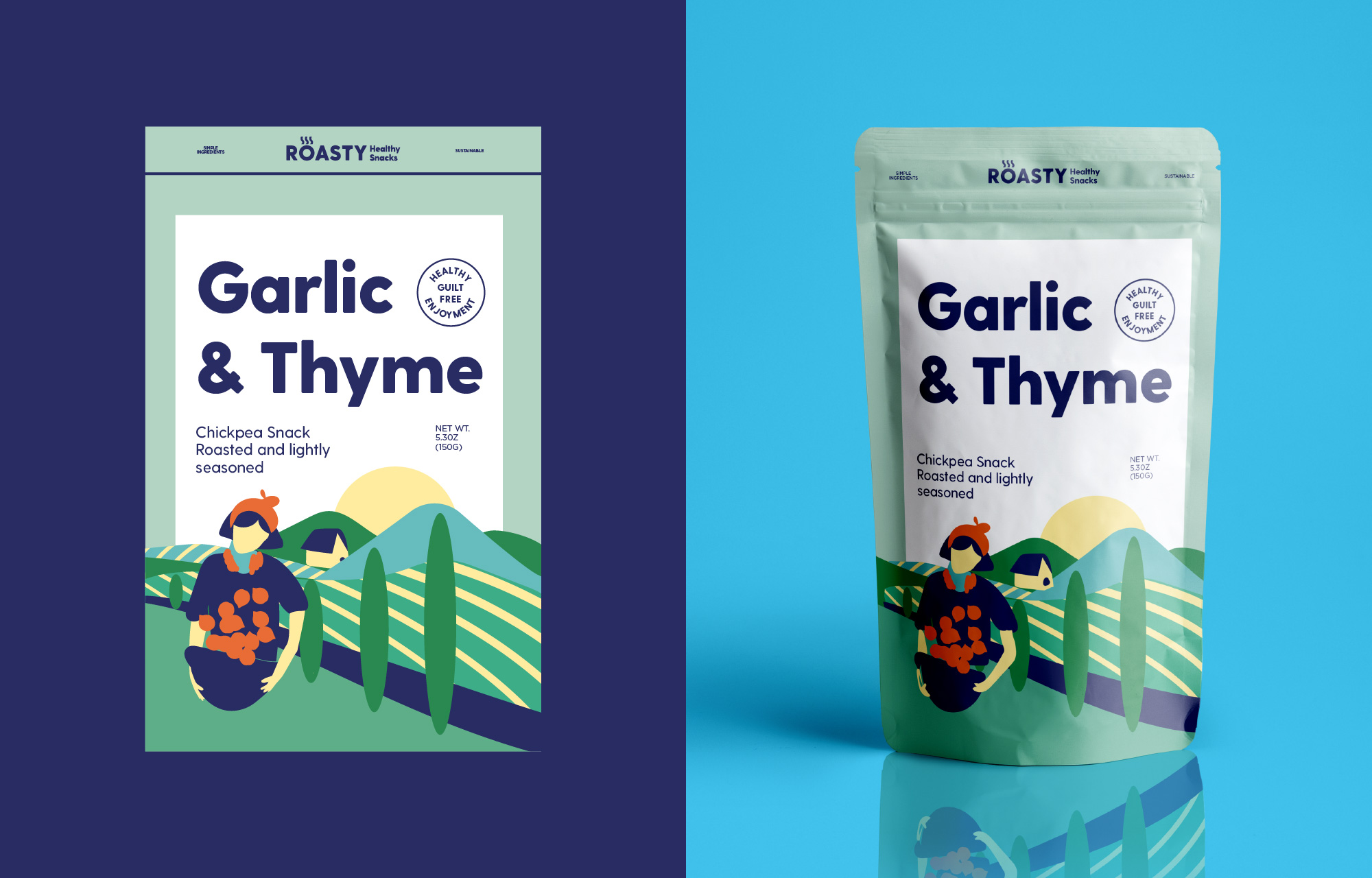 Roasty es un emprendimiento italiano que nació en 2021 como proyecto universitario. Ofrece snacks de garbanzos tostados, saludables y sabrosos. Desde el estudio desarrollamos su identidad visual y diseño de packaging, creando una marca moderna, colorida y con personalidad. El objetivo fue destacarse en el competitivo mercado europeo.